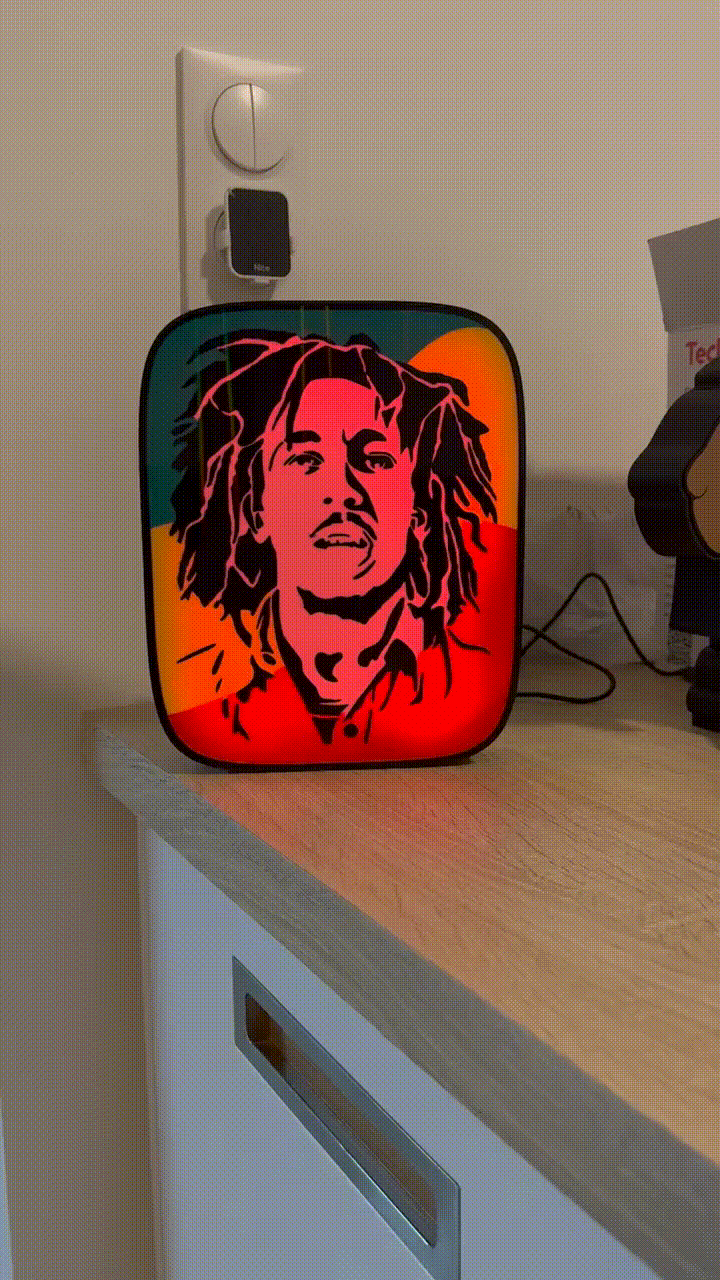 # Lámpara LED Bob Marley Ilumina tu espacio con el espíritu de la música y la buena vibra. Esta lámpara LED temática de Bob Marley es el regalo perfecto para fans de la leyenda del reggae. Su diseño llamativo y colorido transforma cualquier habitación en un rincón inspirador, ideal para dormitorios, salas de estar o espacios de relajación. Con tecnología LED eficiente, proporciona una iluminación suave y envolvente que crea el ambiente perfecto para disfrutar de tus canciones favoritas. Un detalle único que combina arte, música y funcionalidad en una sola pieza.