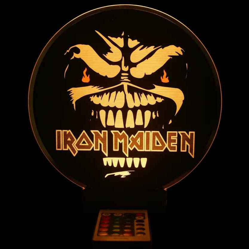 # Lámpara RGB Iron Maiden Ilumina tu espacio con la energía cruda del metal. Esta lámpara decorativa RGB combina diseño en hierro con tecnología LED de cambio de color para crear una atmósfera única. Alterna entre tonos rojo intenso, azul eléctrico y púrpura oscuro según tu estado de ánimo. Perfecta para fans del metal, gamers y decoradores atrevidos que buscan un toque legendario. Construcción robusta y presencia imponente garantizada.
